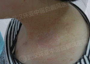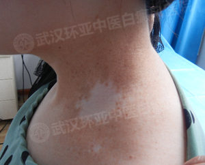 患者小的时候就得病,非常自卑,酷暑也戴着围巾,其家人介绍说患者非常在意颈部的白斑,一年四季从来没有脱过围巾。家人带着到处治疗,没有效果,也对治疗失去信心。患者年纪越来越大,但是从不和男生交往,家人非常担心。