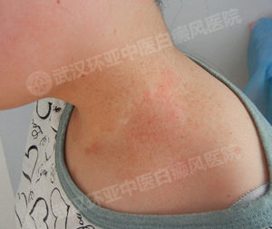 由于患者患病时间比较长,我院专家帅海林主任为其做了详细的检测,发现她肩部白斑色素脱失较为严重,针对患者心理焦虑,情绪低落的情况,医生给予心理宽慰,通过疾病治疗方法跟众多患者康复案例的讲解,患者对治疗才稍微有了信心。